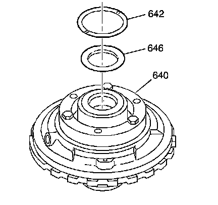 26. Install the reaction carrier thrust washer (642) (brass) into the recess of the center support assembly (640). Retain the reaction carrier thrust washer (642) with J 36850 or equivalent.