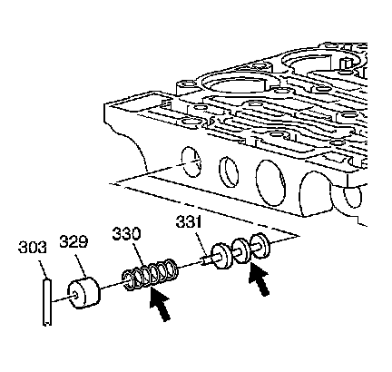 28. Remove the shift valve fluid filter bore plug pin (303).