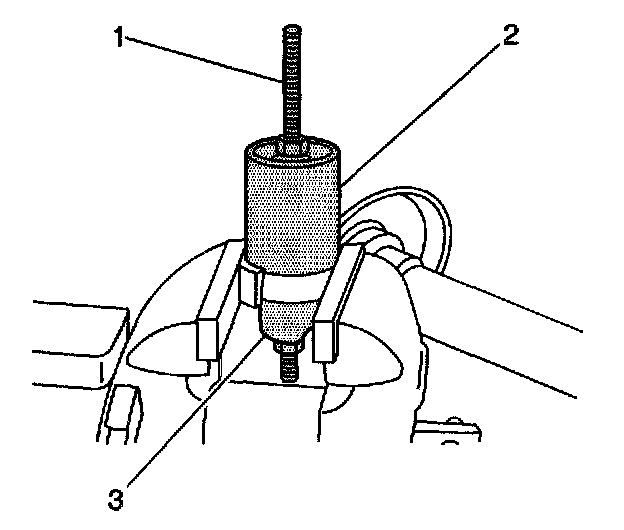 3. Install the J45850-2 (2), J45850-1 (3), the forcing screw, the thrust bearing, the washers, and the nuts (1) over the inner shaft housing bushing as shown.