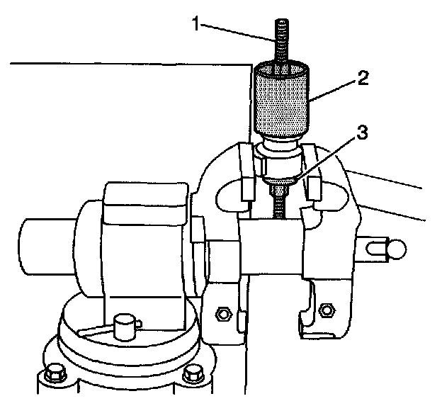 7. Install the J45850-2 (2), J45850-1 (3), the forcing screw, the thrust bearing, the washers, and the nuts (1) over the inner shaft housing bushing as shown.