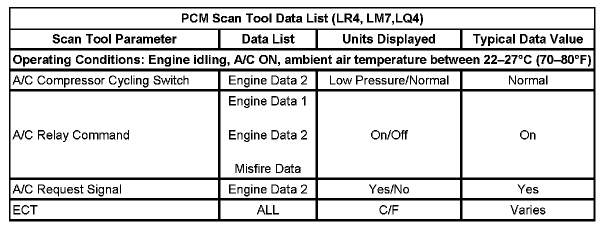 The scan tool data values were taken from a known good vehicle under the following conditions: