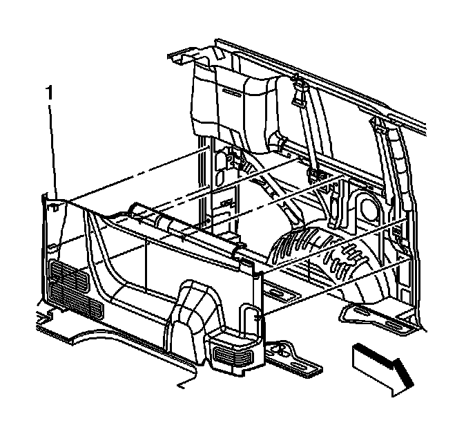 5. Inspect the body side front lower trim panel (1) for broken or missing retaining clips. Replace the retaining clips as needed.