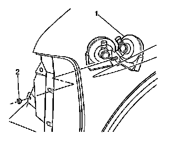 3. Remove the nut (2) that retains the horn mounting bracket (1) to the vehicle.