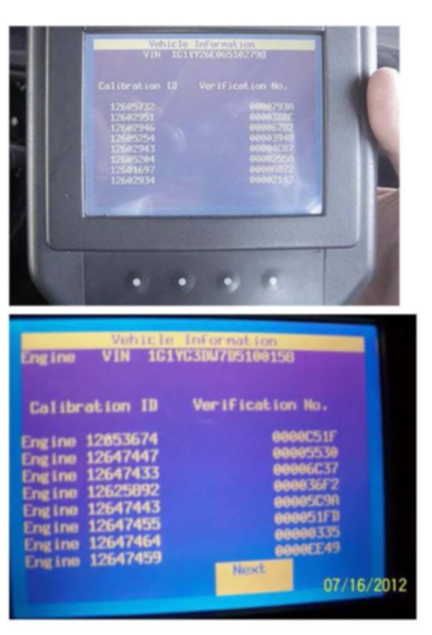 ^ Two examples of the Tech 2 Vehicle Information - (Engine) Calibration ID and Verification No. screens are shown.