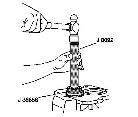 14. Using the J 38856 with the J 8092, install a NEW front countershaft bearing cap. When properly installed, the outer lip of the cap will be flush with case.