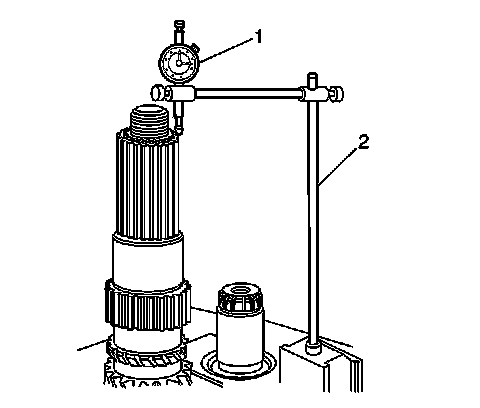 1. Using J 26900-13 (2), set the J 8001 (1) on the end of the mainshaft.