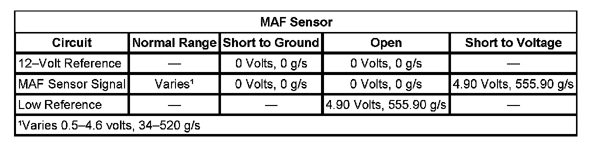 The MAF sensor produces an output voltage based on the inlet air flow through the air induction system. This output voltage will display on the scan tool as a voltage parameter and as a grams per second (g/s) parameter. If the ECM detects that the actual MAF sensor voltage signal is more than or less than the possible range of a normally operating sensor it will set a DTC.