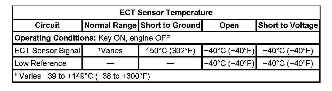 Measure and record the resistance of the ECT sensor at various ambient temperatures and compare those measurements to the Temperature vs. Resistance table.
