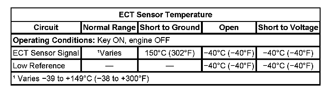 Measure and record the resistance of the ECT sensor at various ambient temperatures and compare those measurements to the Temperature vs. Resistance table.