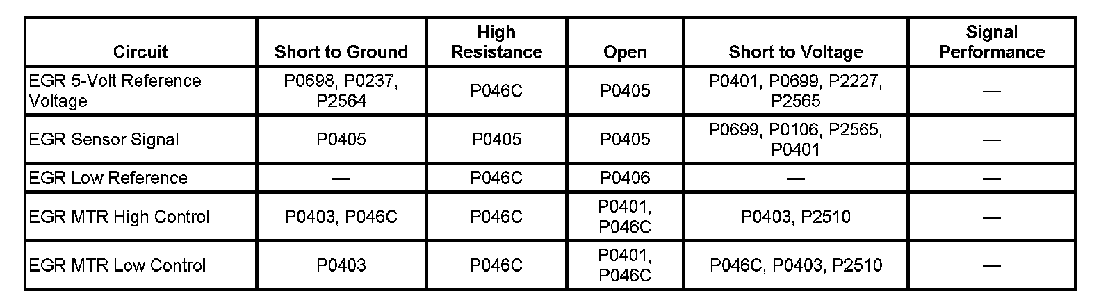 The engine control module (ECM) uses the exhaust gas recirculation (EGR) position sensor to determine the position of the EGR valve. The ECM sends a reference voltage through the 5-Volt reference circuit to the EGR position sensor. The ECM provides a voltage return path for the sensor through the low reference circuit. A variable voltage signal, based on the EGR valve position, is sent from the sensor to the ECM through the EGR position sensor signal circuit. If the ECM detects an EGR position sensor voltage that is less than the normal operating range, DTC P0405 sets.