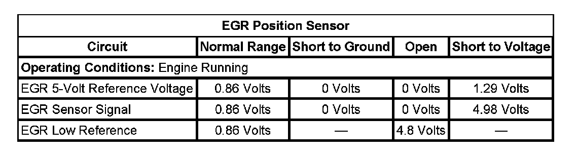 - If the EGR Sensor parameter is less than 4.98 volts, test the signal circuit for an open or short to ground, high resistance, or for a faulty ECM.