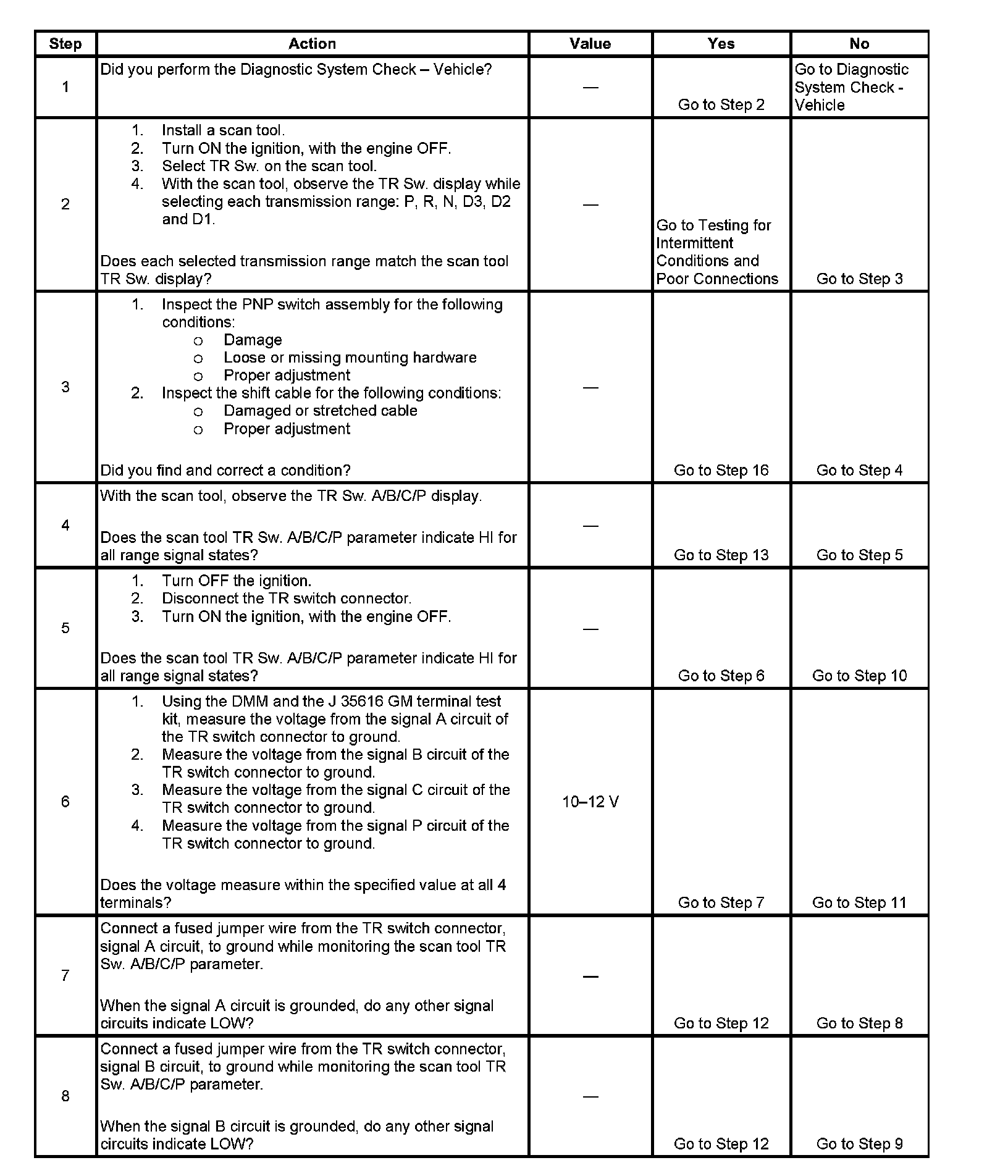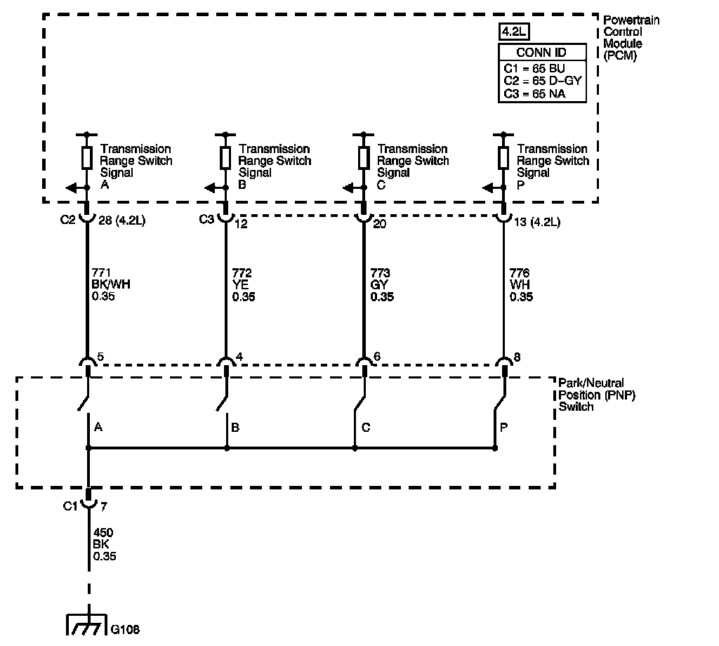 The transmission range (TR) switch is part of the park/neutral position (PNP) and back-up lamp switch assembly and is externally mounted on the transmission manual shaft. The TR switch is a multi-signal switch. The transmission control module (TCM) supplies ignition voltage to the TR switch on 4 signal circuits, A, B, C, and P. Each gear selector lever position grounds one or more of the switch circuits. In order to determine the gear range selected by the driver, the TCM compares the voltage combinations on the signal circuits to a look up table stored in TCM memory. The TCM detects the selected gear range by the state change of the switch input. Refer to Transmission Range Switch Logic.