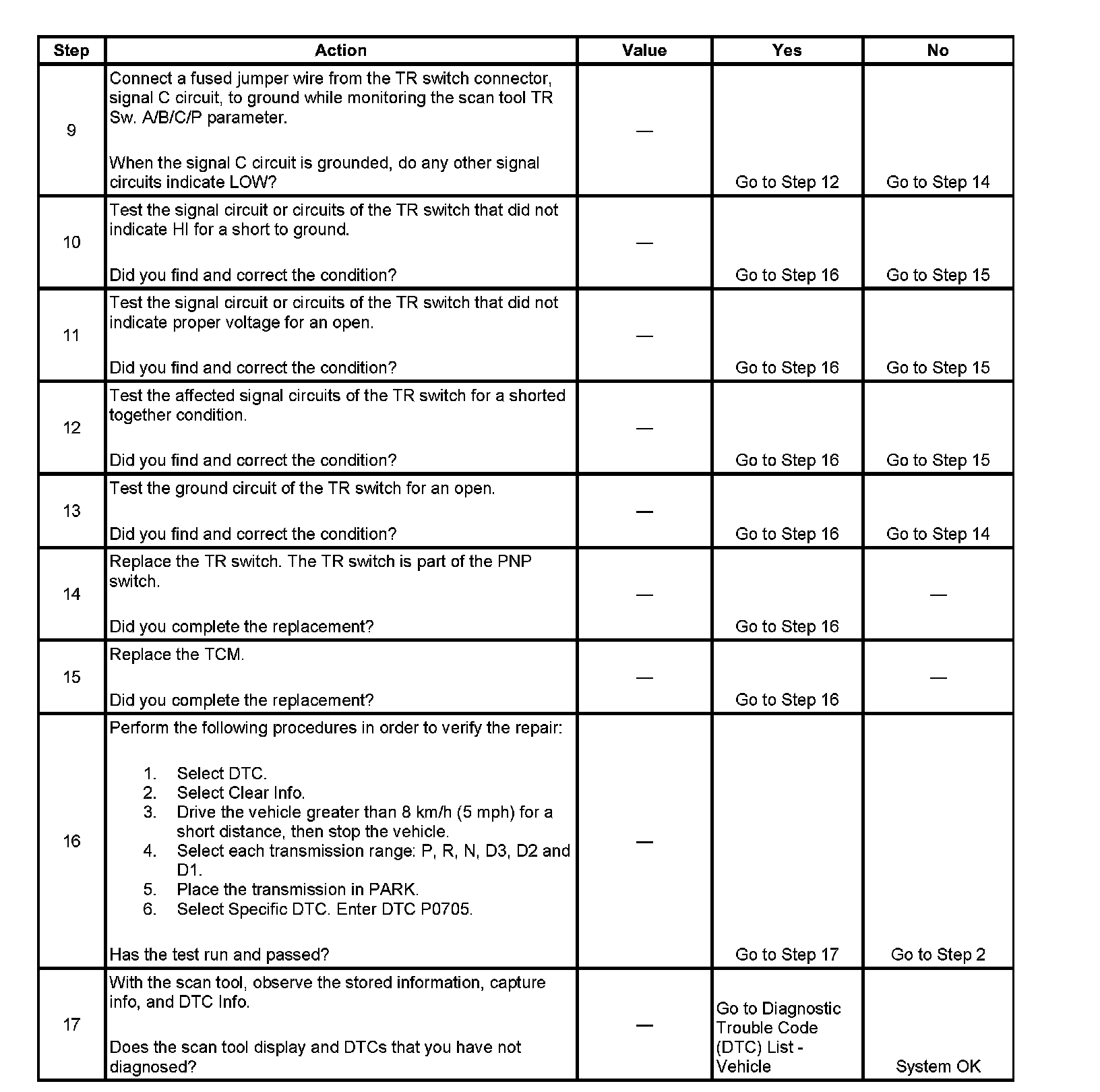 Switch input to the TCM is represented on the scan tool as HI and LOW. HI indicates an ignition voltage signal. LOW indicates a 0 voltage signal. The 4 parameters represent transmission range switch signal A, B, C and Parity. When the TCM detects an invalid TR switch signal combination, then DTC P0705 sets. DTC P0705 is a type C DTC.