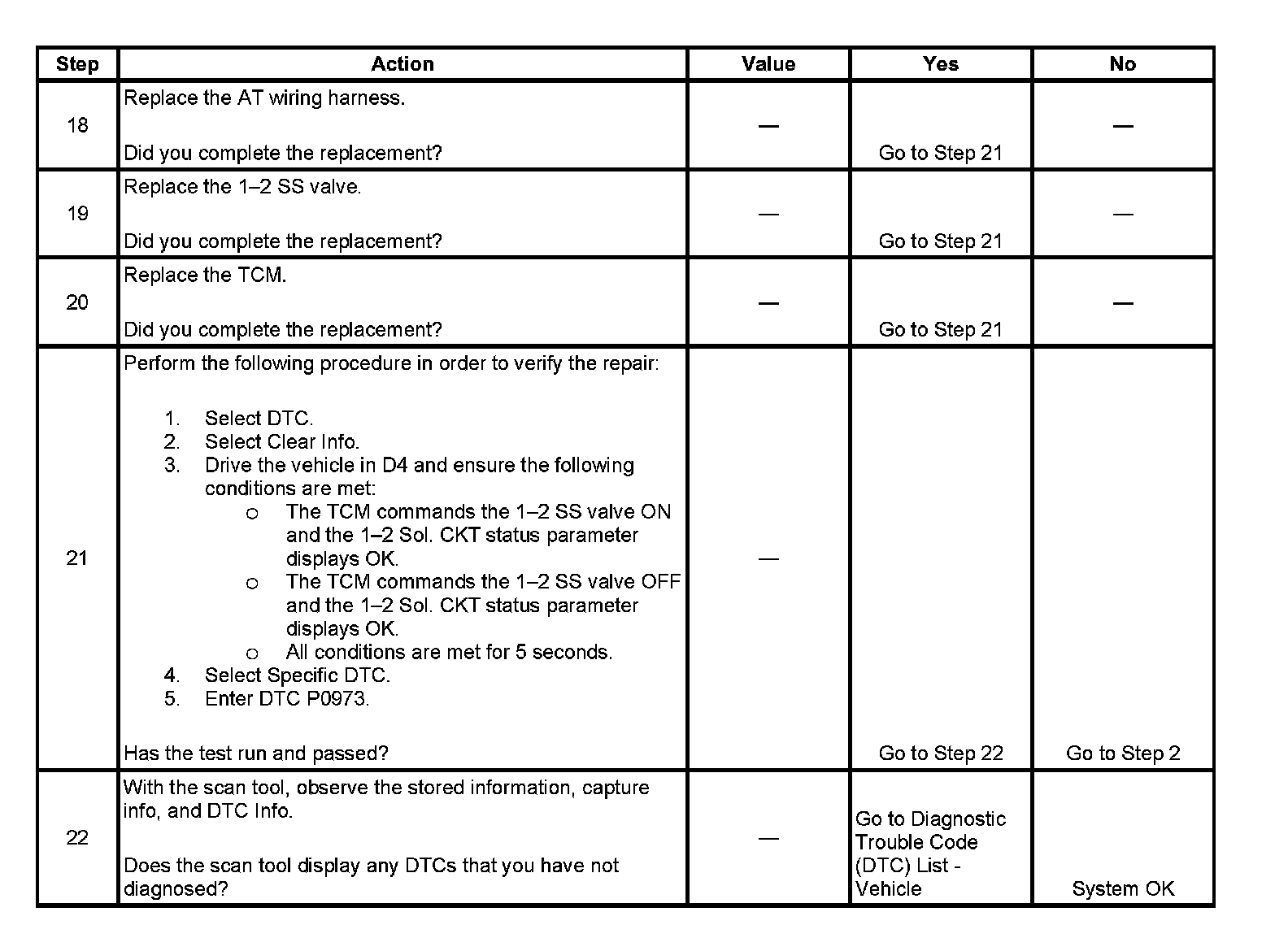 When the TCM detects a continuous open, short to ground in the 1-2 SS valve circuit, then DTC P0973 sets. DTC P0973 is a type B DTC.