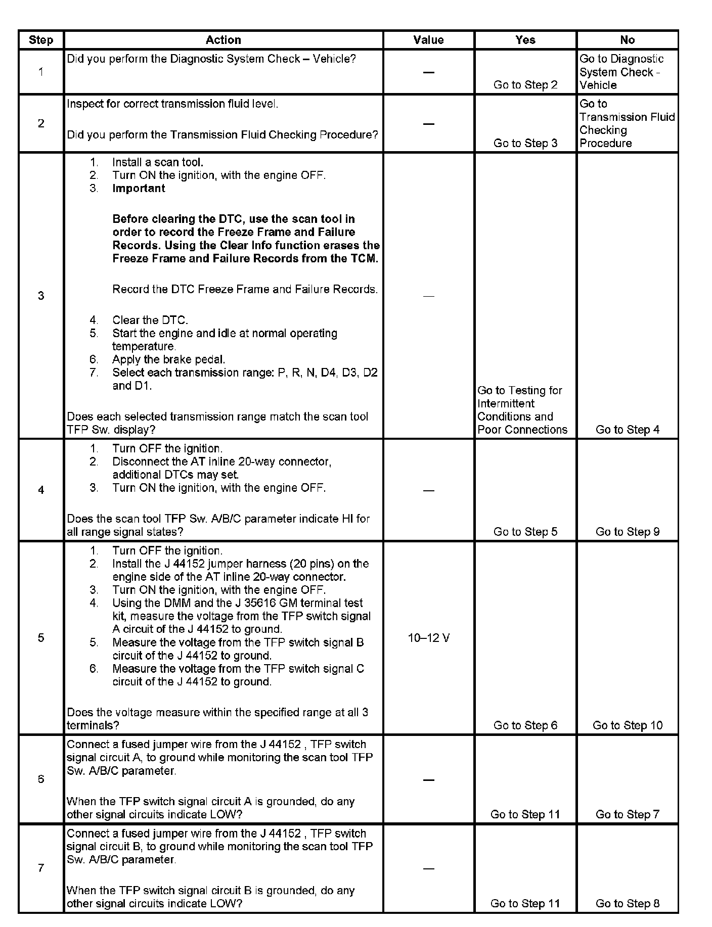 ^ Refer to Transmission Fluid Pressure (TFP) Manual Valve Position Switch Logic for the normal range signals and the invalid combinations. On the table, LOW is 0 volts, HI is ignition voltage.