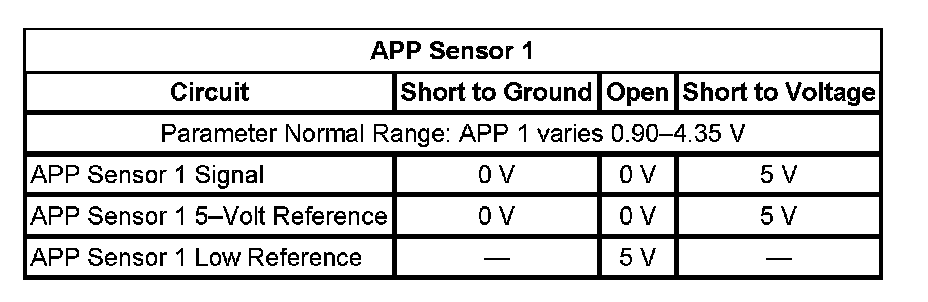 - If more than 01 volts, test the APP sensor 1 and 2 signal circuits for a short to voltage or a faulty ECM.