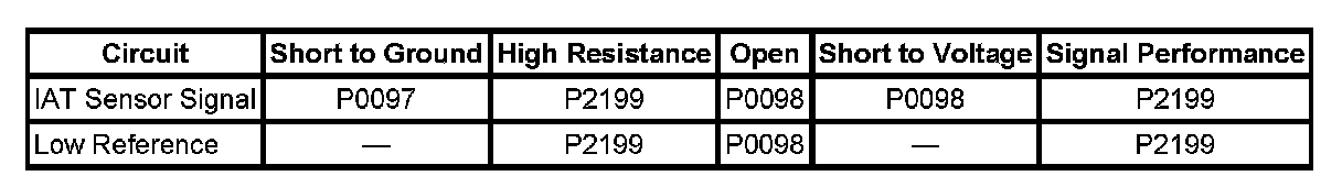 The intake air temperature (IAT) sensor 2 is a variable resistor. The IAT 2 sensor measures the temperature of the air at the engine intake manifold. The engine control module (ECM) supplies 5 volts to the IAT 2 signal circuit, and a ground for the IAT 2 low reference circuit. When the IAT 2 sensor is cold, the sensor resistance is high. When the intake manifold air temperature increases, the sensor resistance decreases. With high sensor resistance, the ECM detects a high voltage on the IAT 2 signal circuit. With lower sensor resistance, the ECM detects a lower voltage on the IAT 2 signal circuit. The ECM monitors the IAT 2 and the IAT signal voltages for a signal voltage that is not within a calibrated range of each other.