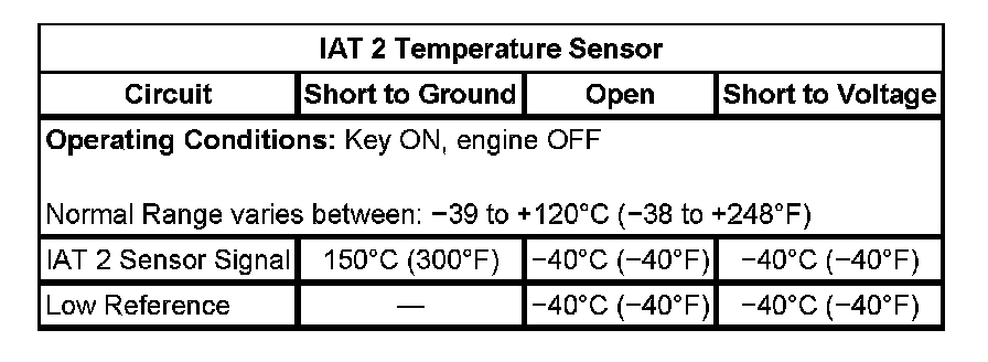 At start-up, after a 10 hour engine soak time, the IAT 2 sensor temperature is more than 5.3°C (9°F) higher or lower than the IAT Sensor.
