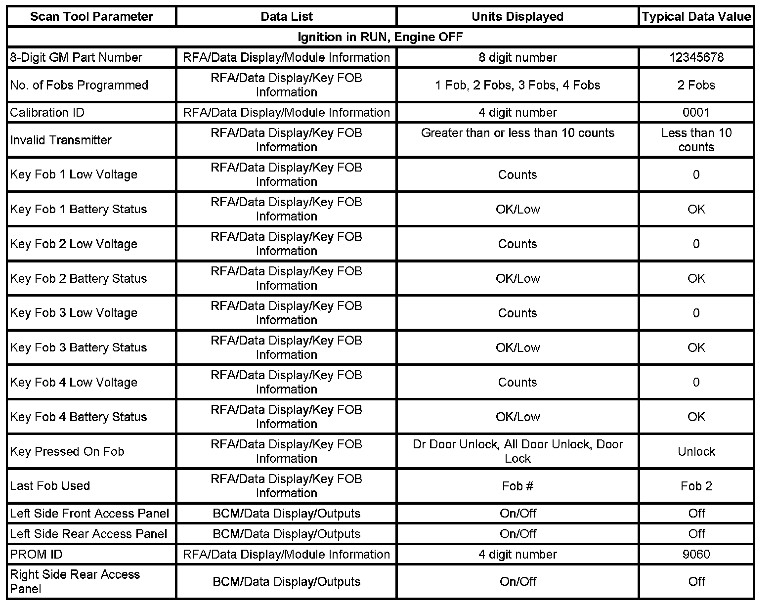 The Keyless Entry/Access Panel Scan Tool Data List contains all of the related parameters that are available on the scan tool. The parameters in the list are arranged in alphabetical order. The column, Data List, indicates the location of the parameter within the scan tool menu selections. Use the Keyless Entry/Access Panel Scan Tool Data List as directed by a diagnostic table or in order to supplement the diagnostic procedures. Begin all of the diagnostic procedures with Diagnostic System Check - Vehicle. Initial Inspection and Diagnostic Overview