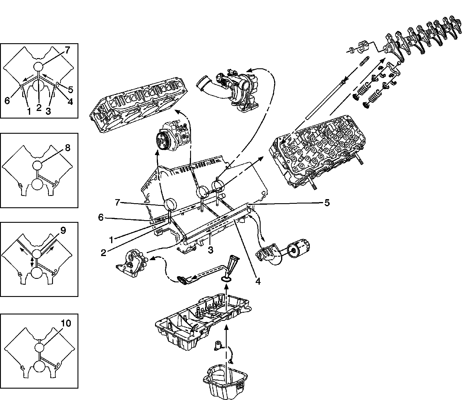 Oil flows from the crankshaft/camshaft bearing galleries (2) to the number 2 and 5 camshaft bearings (8).