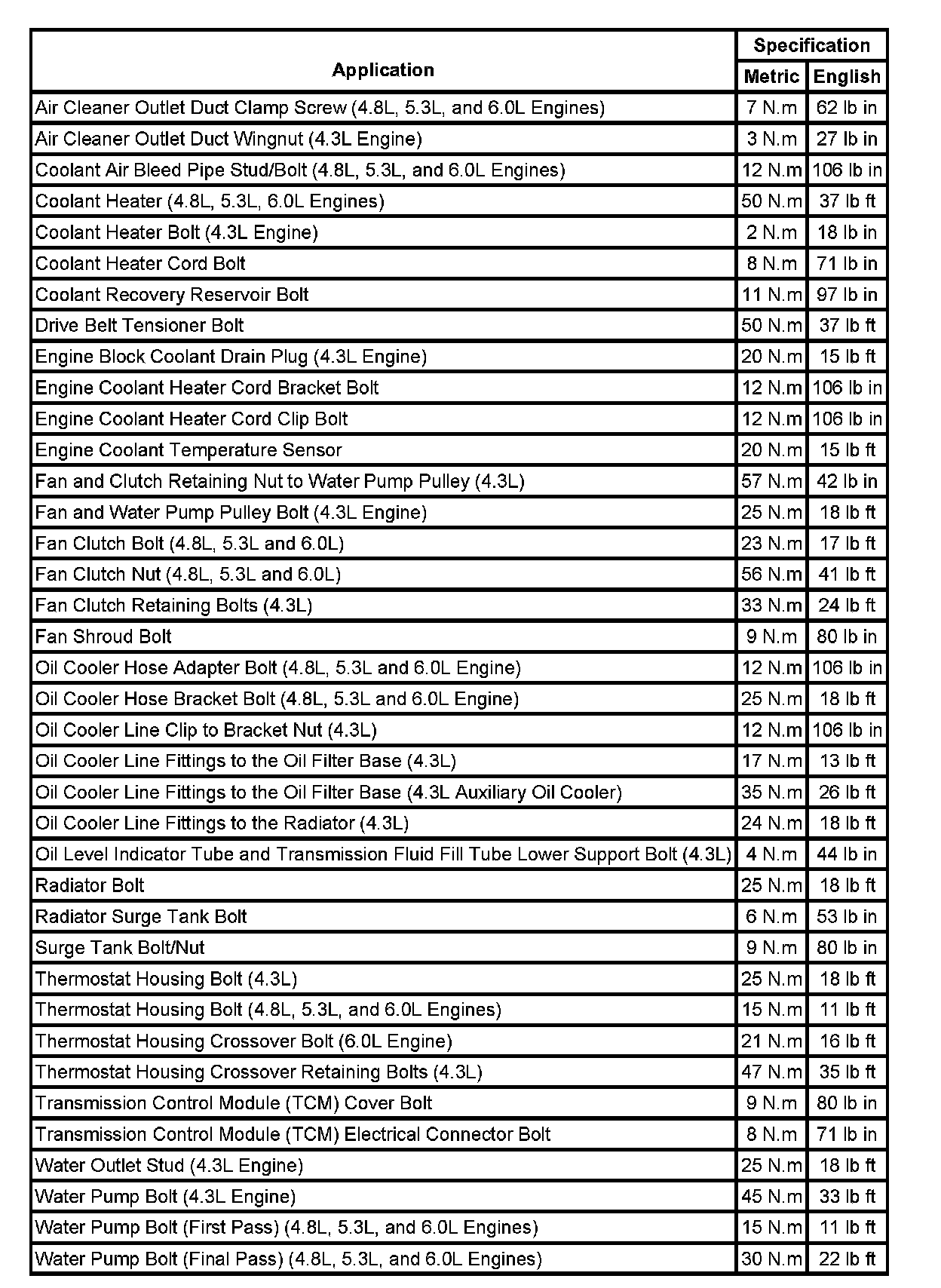 Fastener Tightening Specifications: