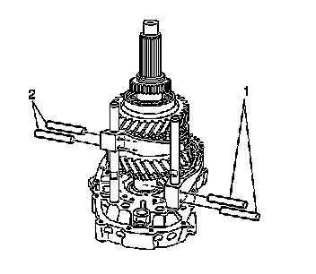 38. Using the J 44730 (2) and the J 44707 (1) on the countershaft, remove the 6th gear synchronizer hub and 6th gear bushing.