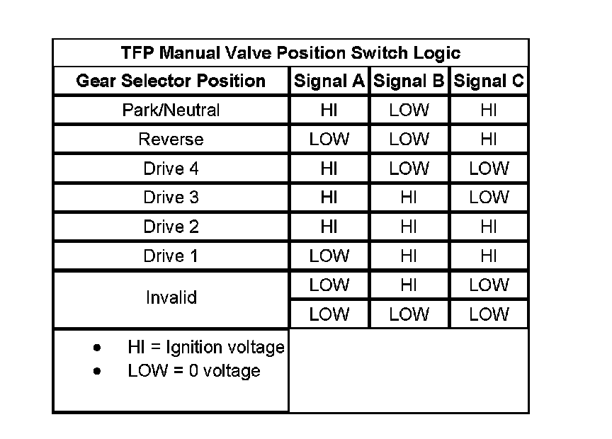 Transmission Fluid Pressure (TFP) Manual Valve Position Switch Logic: