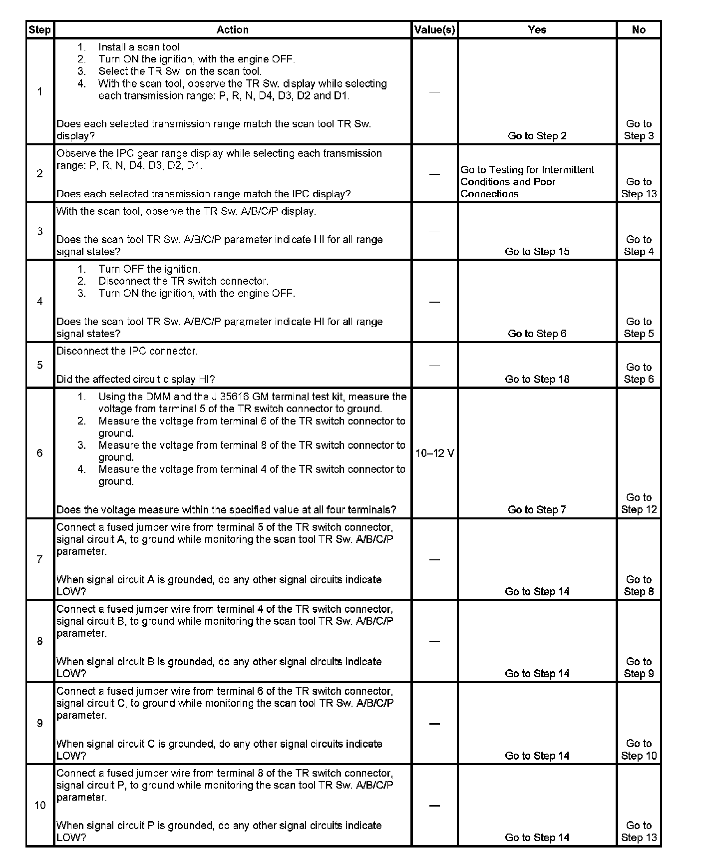 Refer to Transmission Range Switch Logic for valid combinations of switch signal circuits A, B, C and Parity. In the table, HI indicates an ignition voltage signal. LOW indicates a zero voltage signal.