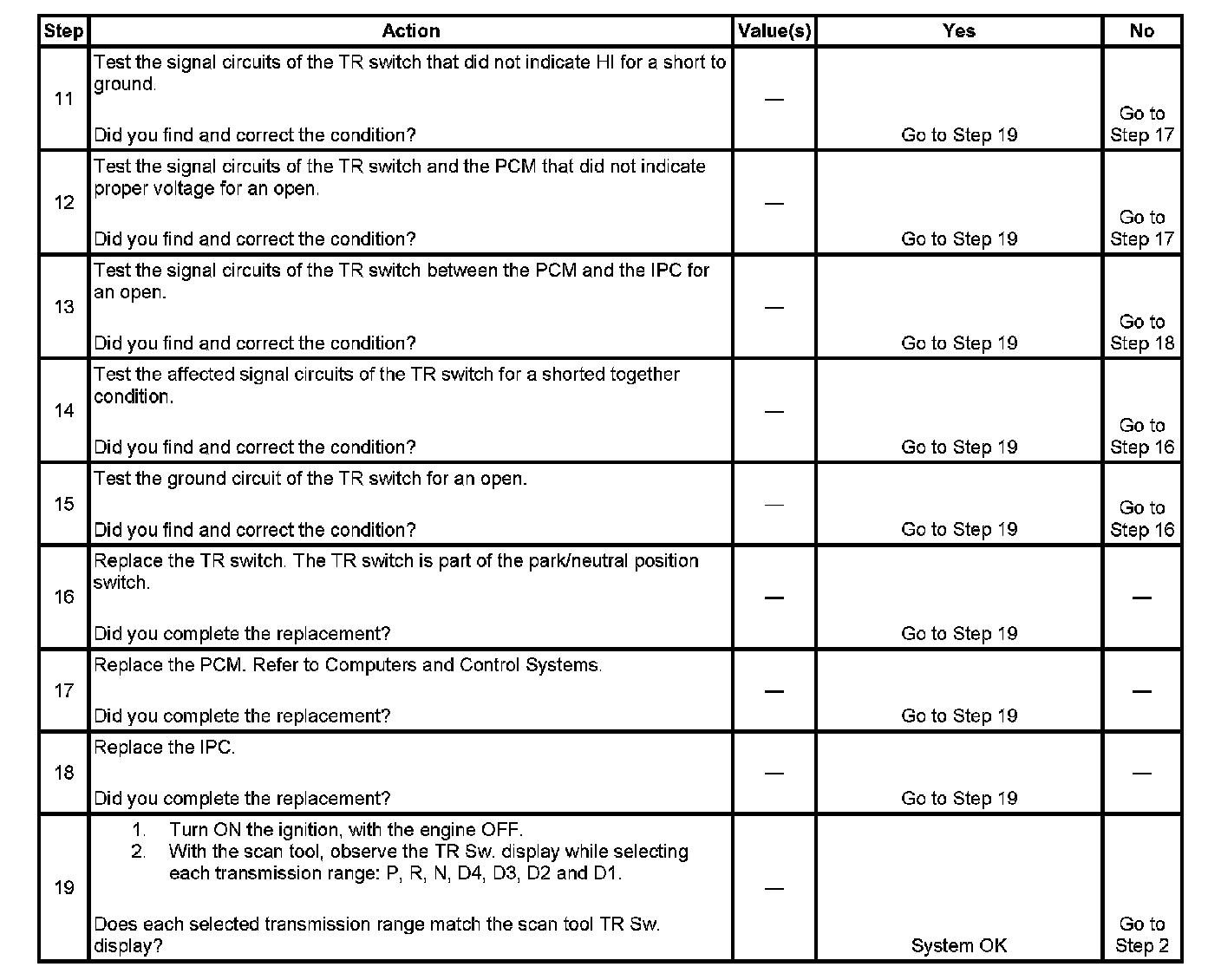 6. This step tests the TR switch wiring for an open or the lack of the signal voltage from the PCM.