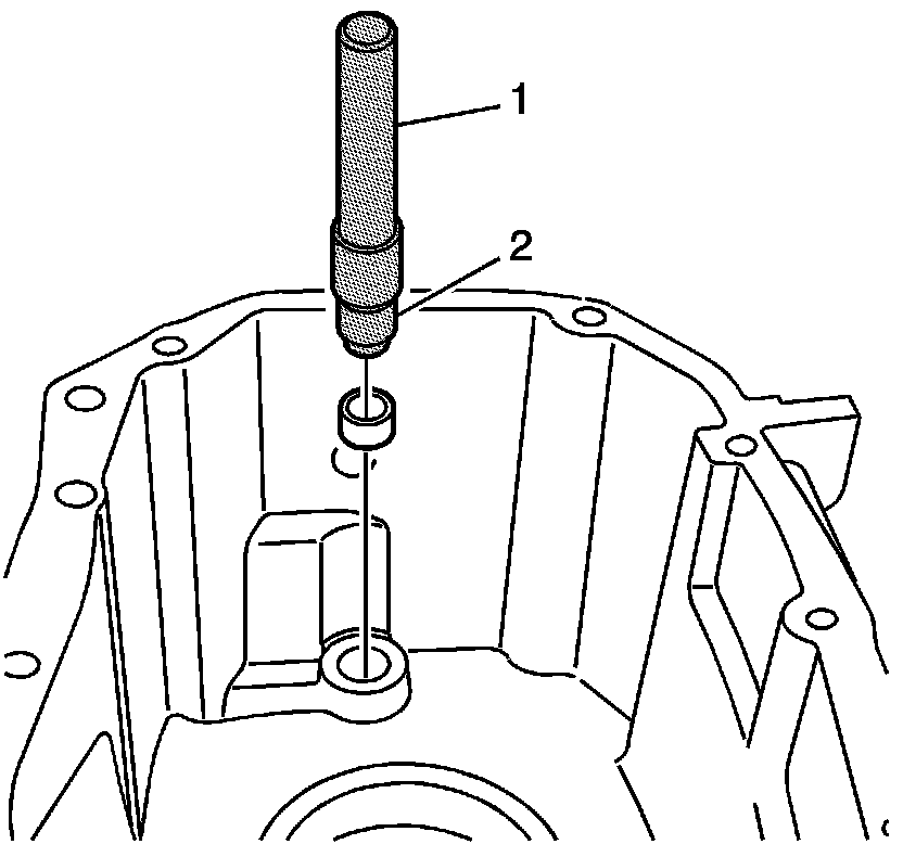 2. Using the J 36798 (2) with the bushing side against the bushing and the J 36190 (1), install the shift shaft bushing in the clutch housing.