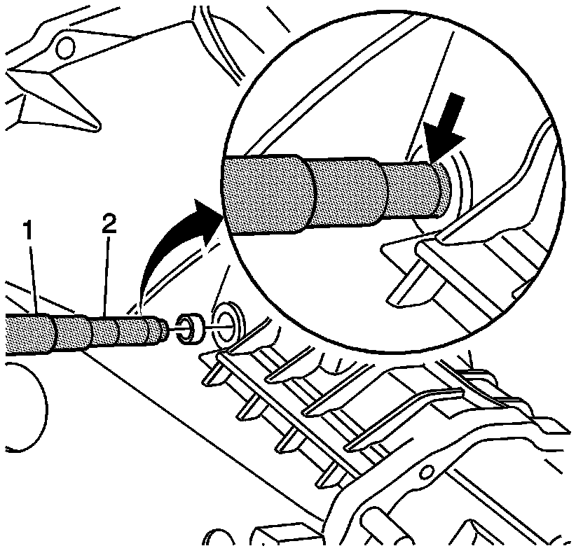 5. Using the J 36507 (2) and the J 36190 (1), install the outer shift shaft detent bushing to the first mark on the J 36507.