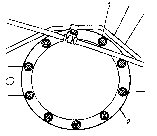 3. Remove the rear axle housing cover bolts (1). Discard the rear axle housing cover bolts.