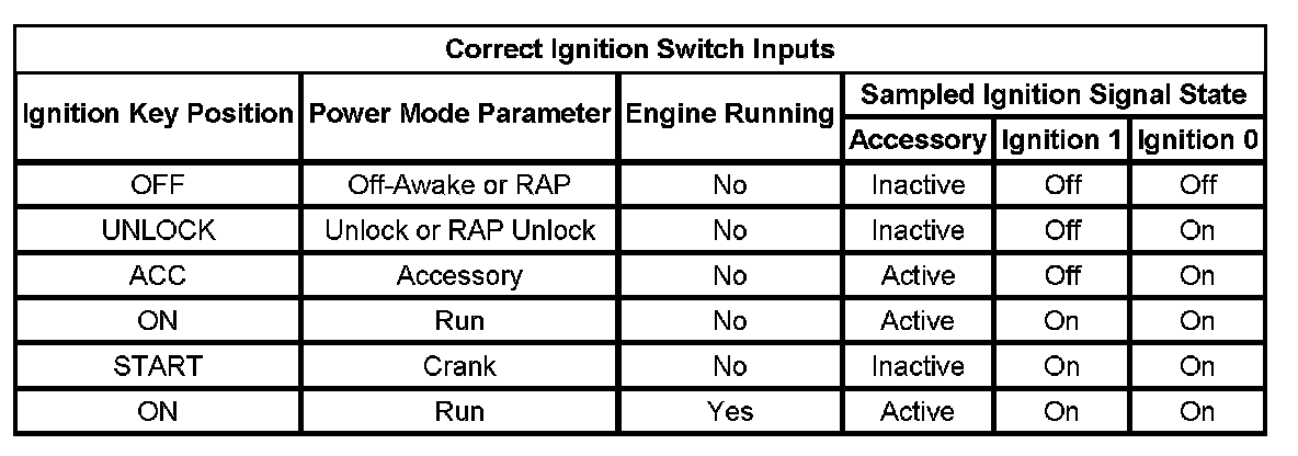 Those modules that have discrete ignition signal inputs also remain in the state dictated by the last valid BCM message received on the serial data circuits. They then check the state of their discrete ignition input to determine the current valid state. If the discrete ignition input is active, B+, the modules will fail-safe to the RUN power mode. If the discrete ignition input is not active, open or 0 voltage, the modules will fail-safe to OFF-AWAKE. In this state the modules are constantly checking for a change status message on the serial data circuits and can respond to both local inputs and serial data inputs from other modules on the vehicle.