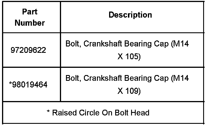 When performing service work on ANY model year Duramax(TM) engine, the main bearing cap bolts must be replaced with the same type of bolt that was originally installed. Use the raised circle identifying mark on the bolt head to determine which bolt to use.