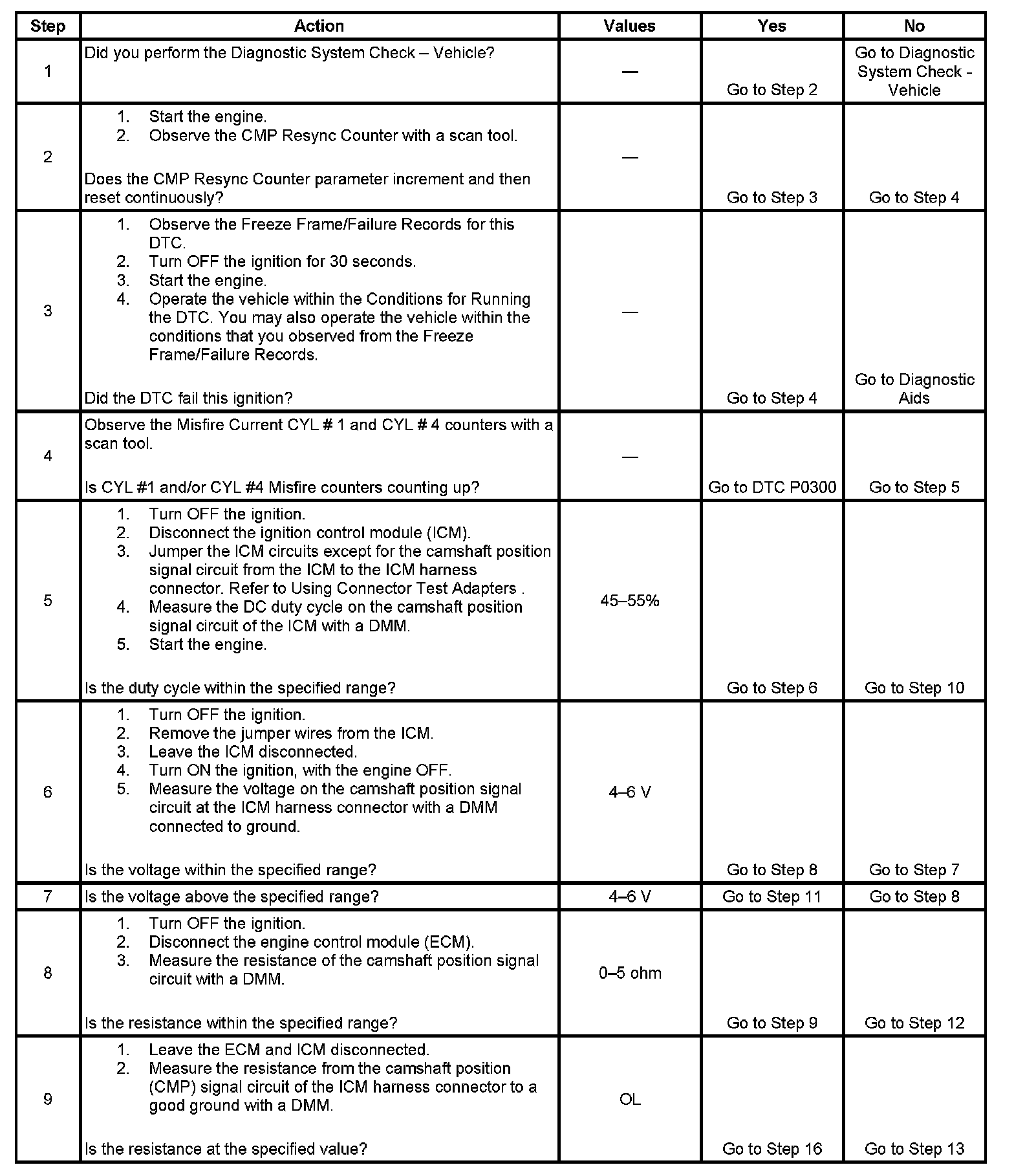 4. If CYL #1 and/or CYL #4 Misfire Counters are incrementing, there is a condition within the secondary ignition system that effects the camshaft position signal circuit.