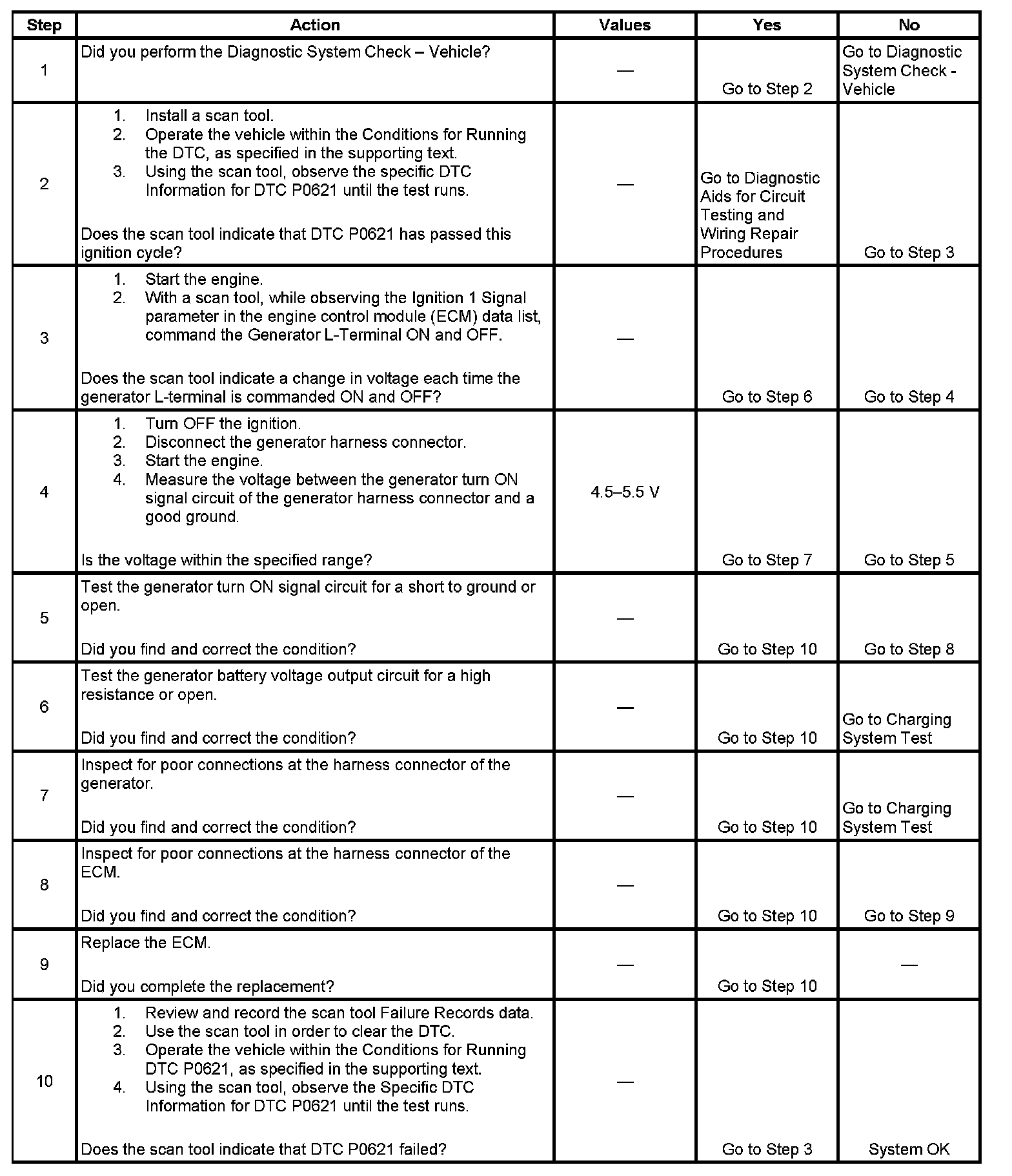 The ECM monitors the state of the generator turn ON signal circuit. With the engine running, the ECM should detect a high generator turn ON signal circuit, or when the charging system malfunctions. If the ECM detects a low generator turn ON signal circuit, DTC P0621 will set. When the DTC sets, the ECM will send a serial data message to the instrument panel cluster (IPC) to illuminate the charge indicator.