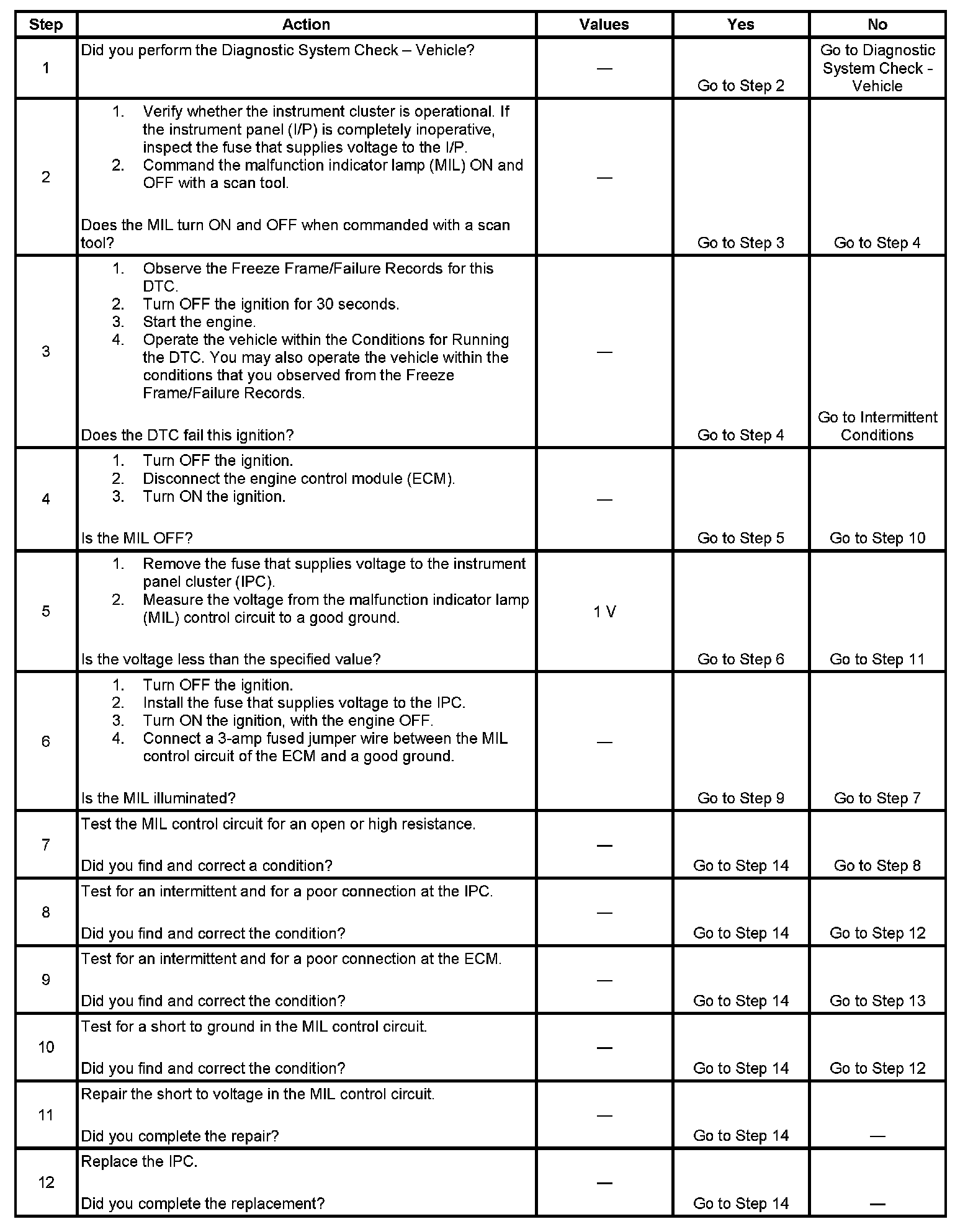 The malfunction indicator lamp (MIL) is located on the instrument panel cluster (IPC). The MIL informs the driver that an emission system fault has occurred and that the engine control system requires service. The control module monitors the MIL control circuit for conditions that are incorrect for the commanded state of the MIL. If the control module detects an improper voltage on the MIL control circuit, DTC P0650 will set.
