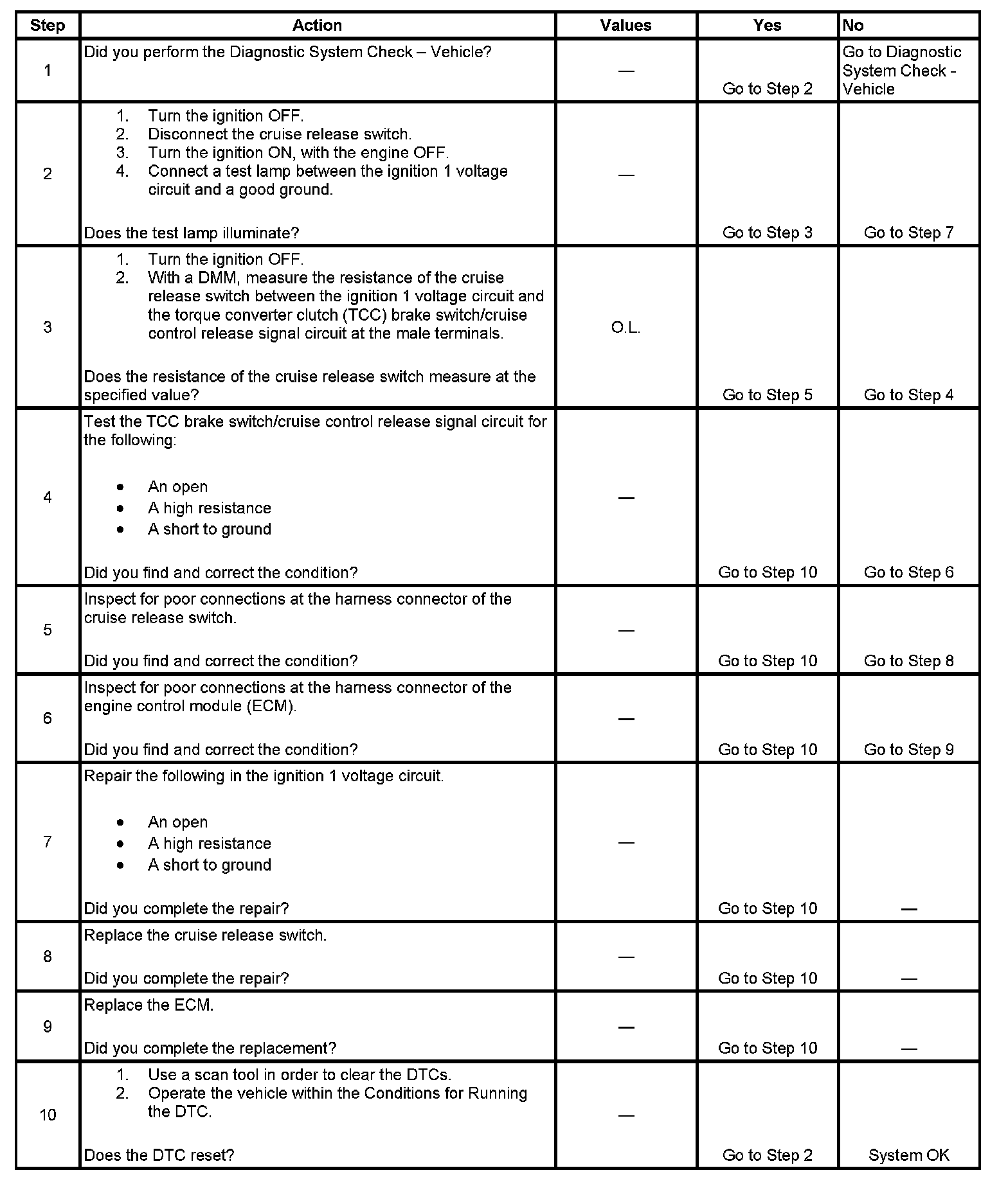 In order to avoid a misdiagnosis, inspect for proper adjustment of the cruise control release switch. Refer to Cruise Release Switch Adjustment.