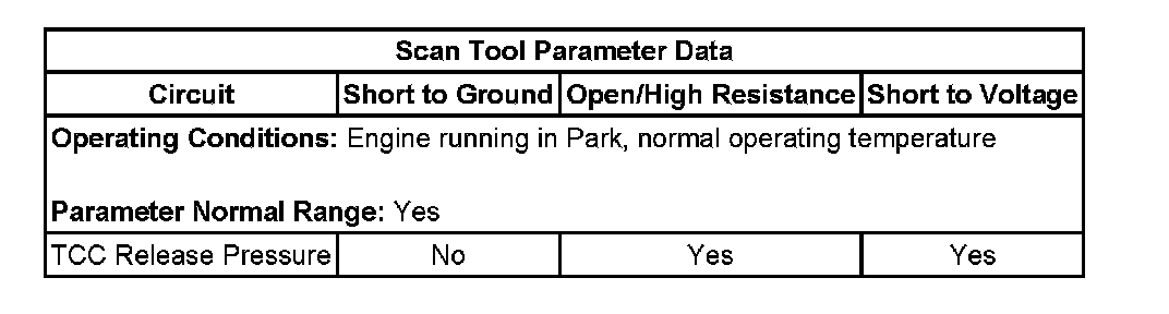 Start the engine in PARK and observe the TCC Release Pressure parameter on the scan tool. The TCC Release Pressure should display Yes. Drive the vehicle in D4 until the transmission shifts into 4th gear and the TCC is commanded ON. Observe the TCC Release Pressure parameter on the scan tool. The TCC Release Pressure should display No.
