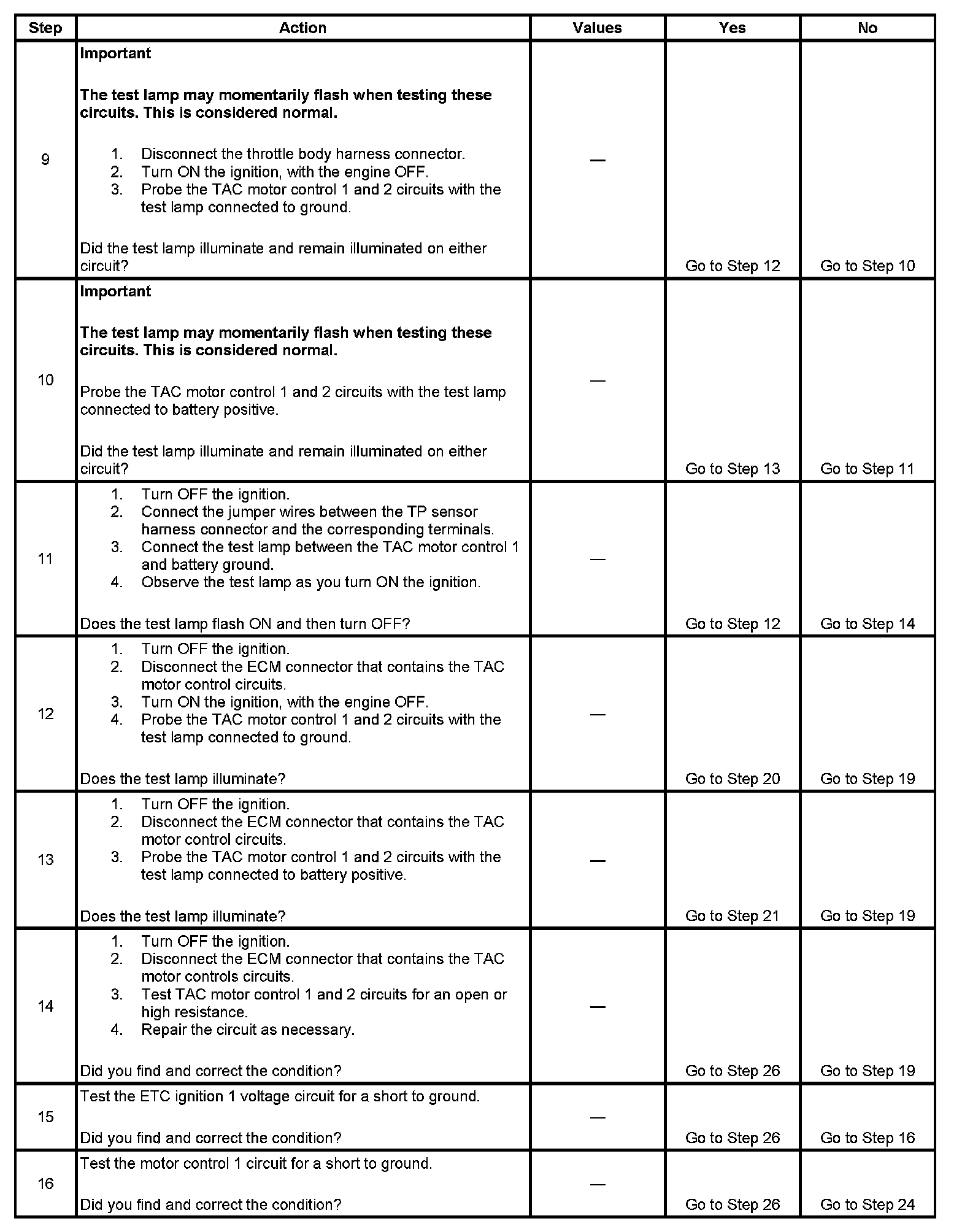11. When the ignition is turned ON, the PCM operates the throttle control motor to verify the integrity of the system prior to start-up. This can be seen by the momentary flash of the test lamp as the ignition is turned ON.