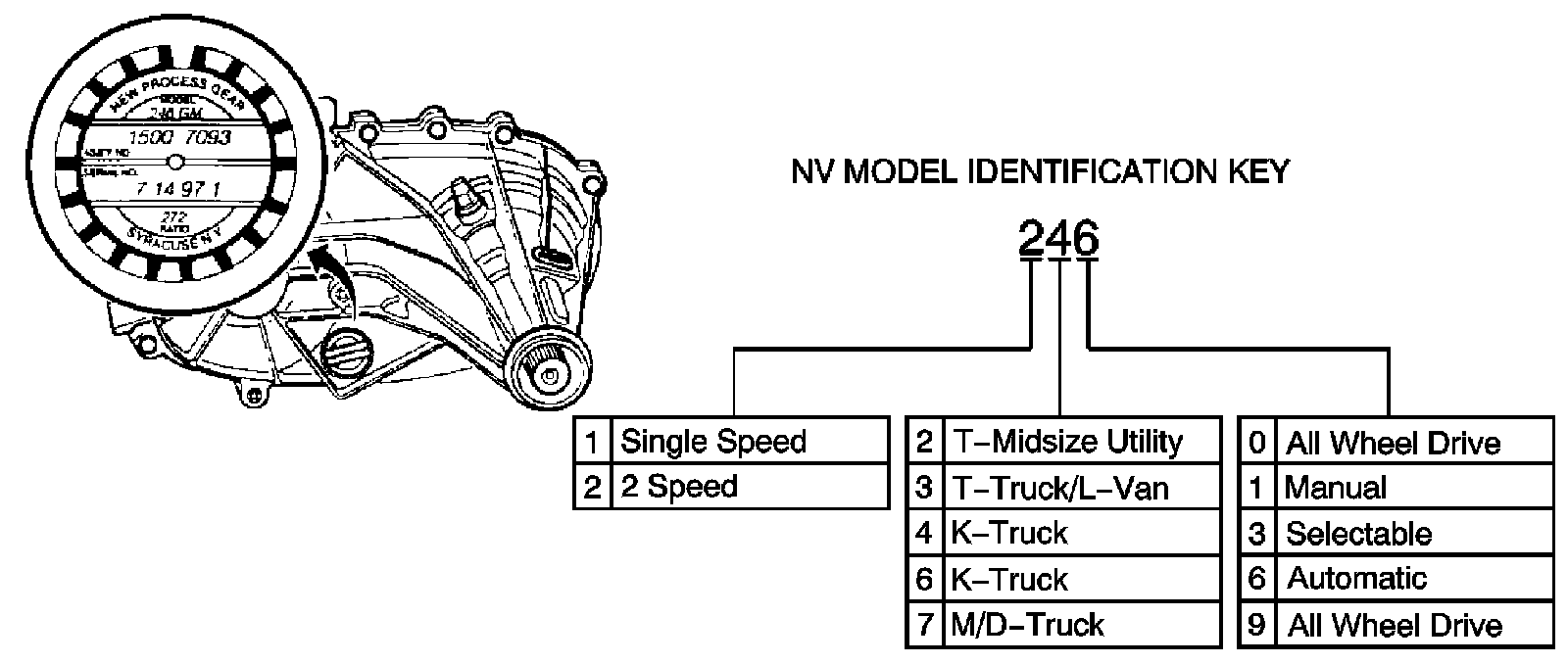 An identification tag is attached to the front half of the transfer case. The tag provides the following information: