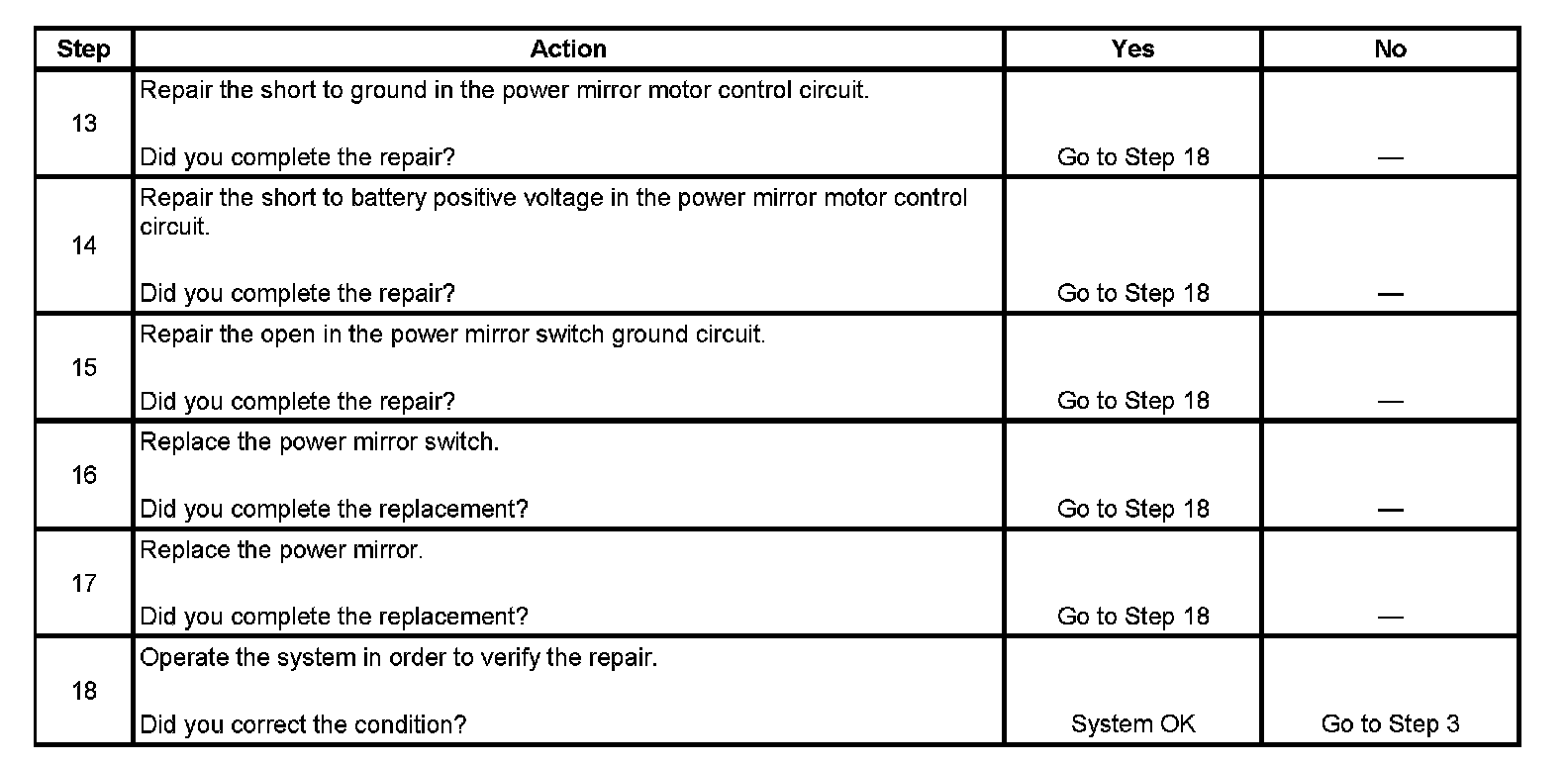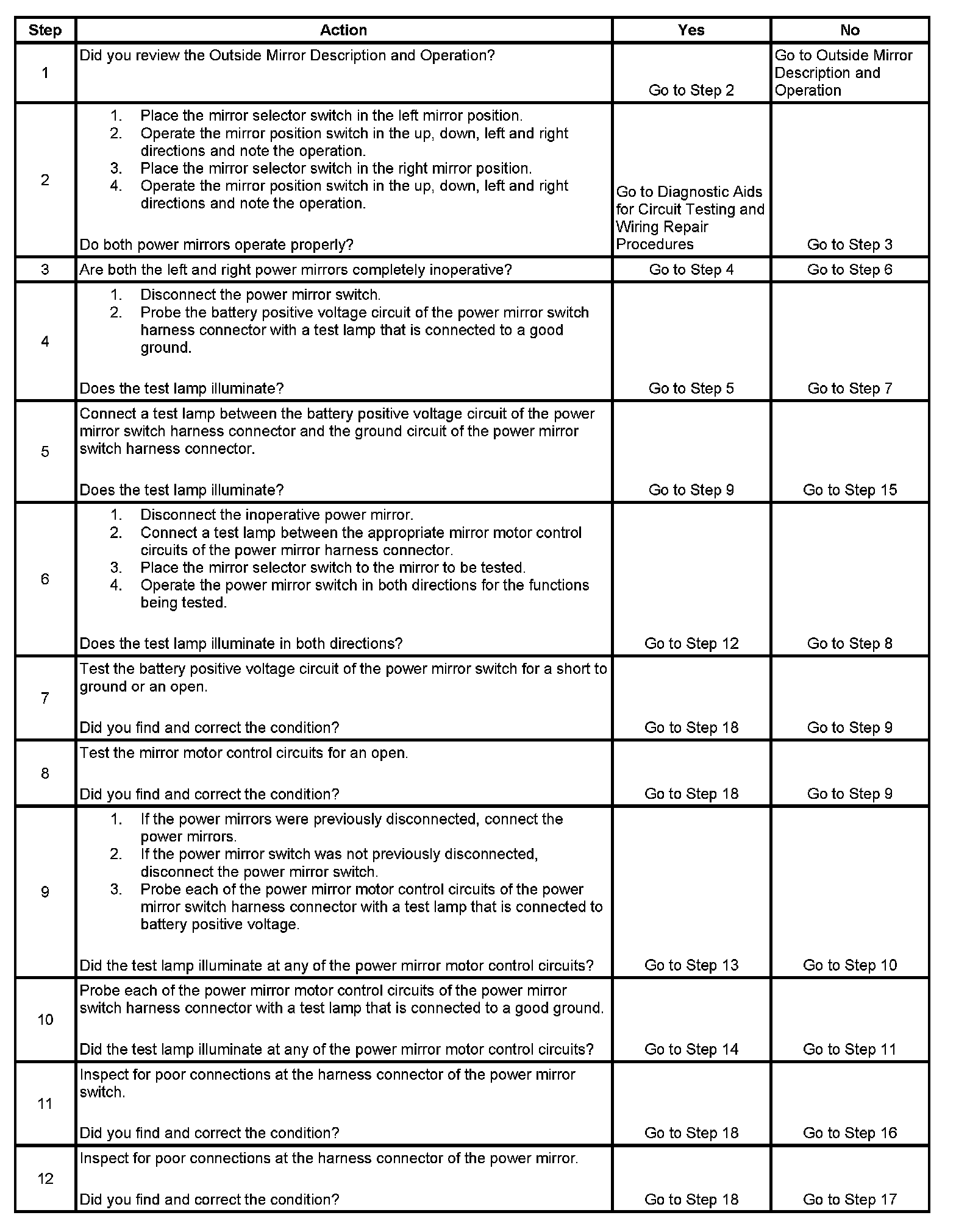 6. This step tests the integrity of both the mirror control circuits and the power mirror switch. If both power mirrors are inoperative on one or more axis, begin testing by disconnecting one of the power mirrors, if an open circuit is detected and repaired for that power mirror, repeat step 6 for the other power mirror.