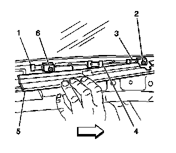 3. Disconnect the sunroof panel side opening closeout covers (5) from the retention clips (1,3,4) in order to access the sunroof window screws (2,6).