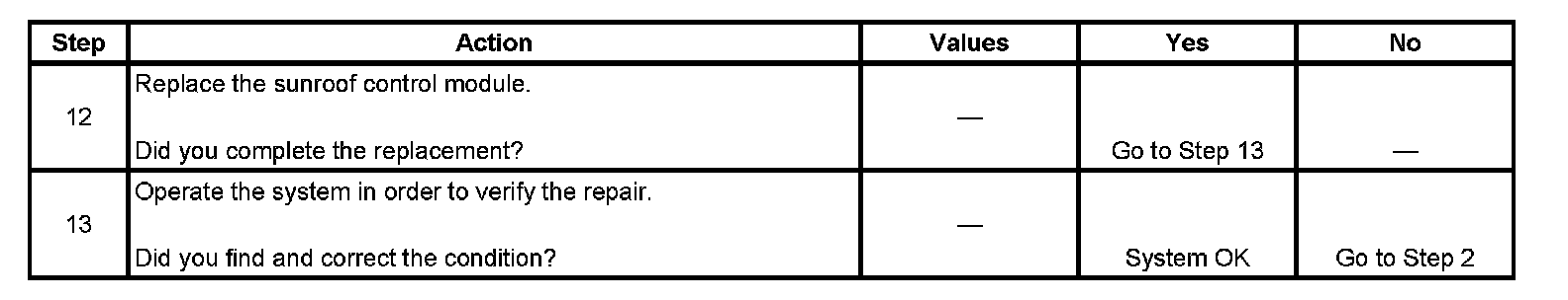 If the sunroof is experiencing an intermittent inoperative condition, check the sunroof switch ground circuit for an open. If the sunroof switch ground circuit is open, the switch may take a redundant path to ground through the switch illumination circuit. When the lights are turned On, the redundant path to ground is removed and the sunroof will become inoperative.