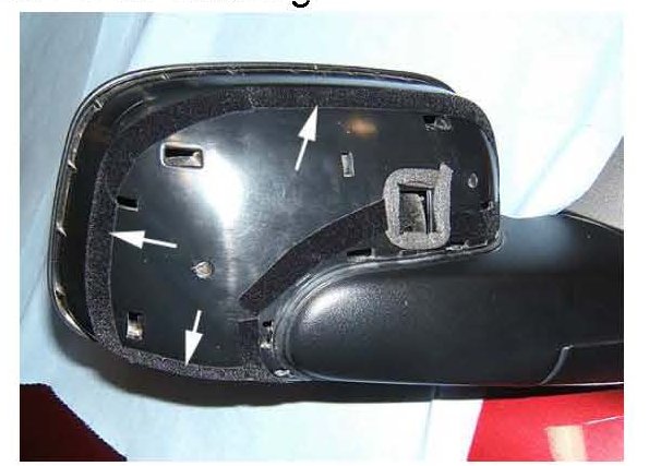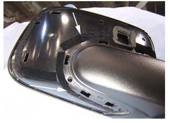 1. Install pieces of flocking tape to the top, sides, and bottom of the back rounded surface of the mirror housing.