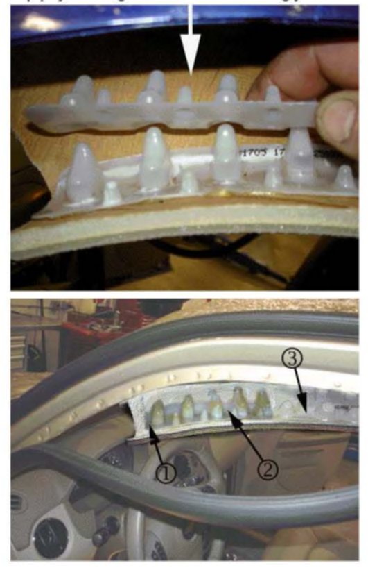 6. Insert the energy absorbing (EA) plastic piece to the headliner trim with hot glue.