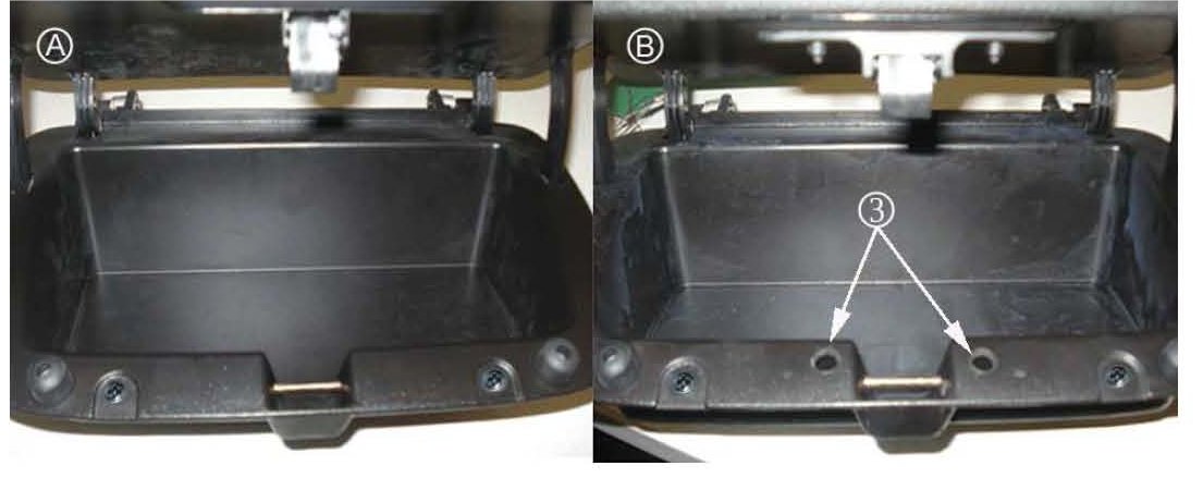 3. Determine if the storage bin is a first (A) or second (B) design storage bin. The second design storage bin (B) includes latch pin holes (3) on the left and right side of the latch.