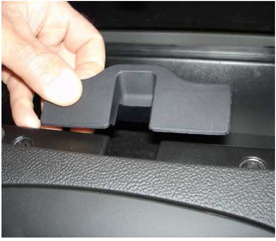 6. Place the reinforcement latch plate bracket against the vertical surface at the rear edge of the bin; then carefully lower it until the adhesive strips contact the horizontal surface. Secure the reinforcement latch plate bracket to the storage bin latch area as shown in the illustration.