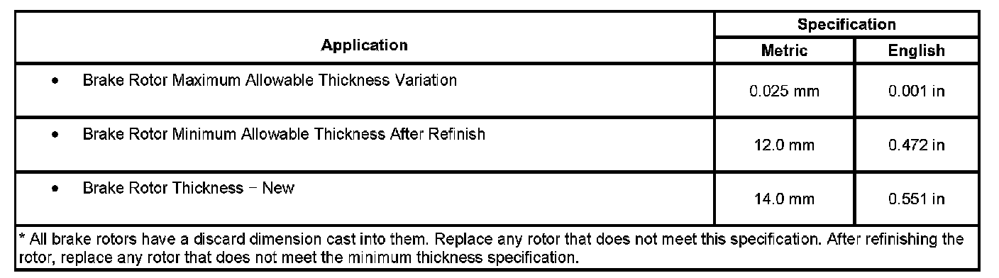 Disc Brake Component Specifications: