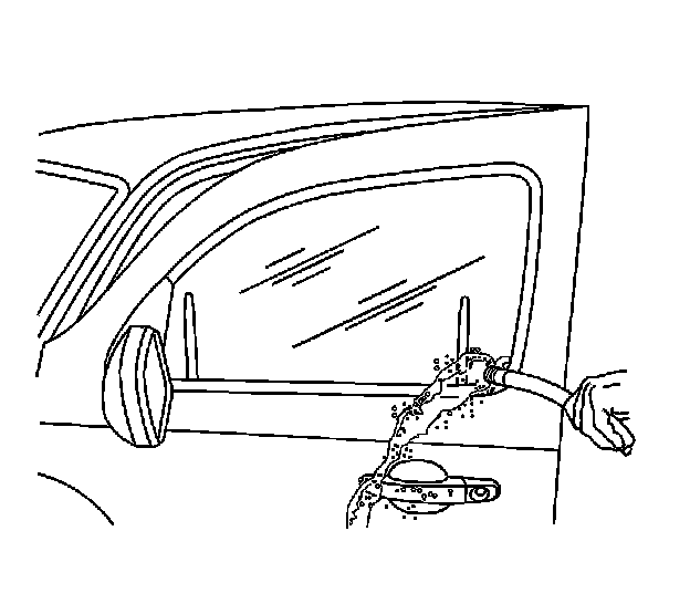 Use two plastic trim sticks and install the sticks between the belt molding and the glass as seen in the illustration above. With the door open, apply water to the glass. Water should only come out of the drains. If water is seen coming from behind the door trim, replace the water deflector. Refer to Front Or Rear Side Door Water Deflector Replacement in SI.